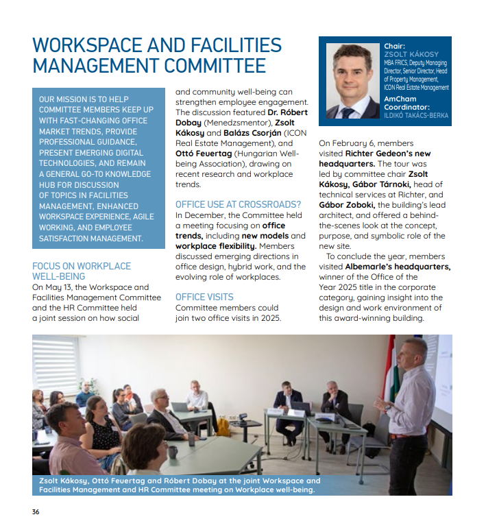 A munkahelyi jóllét témája az elmúlt években jelentős átalakuláson ment keresztül. A korábban jórészt HR-kezdeményezésként kezelt wellbeing mára olyan összetett, stratégiai területté vált, amely egyszerre érinti a vállalati kultúrát, a vezetői döntéshozatalt, a létesítménygazdálkodást és a munkavállalói élményt. A multidiszciplináris megközelítés miatt egyre több szakmai fórum helyezi a figyelem középpontjába a munkavégzés fizikai és közösségi környezetének szerepét — így tett az AmCham Workspace & Facilities Management Committee és a HR Committee közös ülése is, amelyre 2025. május 13-án került sor.