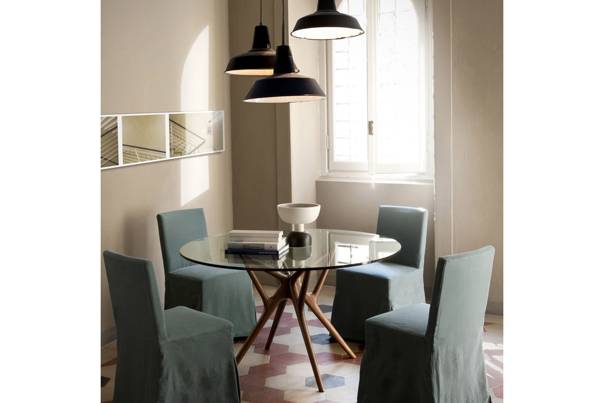 Round or oval dining-table with base in solid canaletta walnut and glass top (thickness mm. 15).